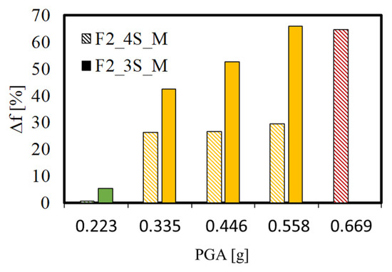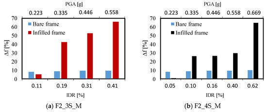 Conversely, in terms of non-structural damage, significant variations in fundamental frequencies are observed for both specimens for an earthquake intensity of 75% (PGA = 0.335 g), which corresponds to an experimentally observed DL1. However, in terms of frequency variation, a significant difference is observed between tests F2_3S_M and F2_4S_M for the same PGA, as shown in Figure 9. Indeed, test F2_3S_M globally shows a greater variation in natural frequency with respect to test F2_4S_M due to the higher flexibility caused by the 5 mm gap between the infill walls and the frame. Indeed, for the same PGA, specimen F2_3S_M reached higher drift ratios when compared to F2_4S_M. Based on the available data, it can be observed that a frequency variation for the first in-plane mode ranging between 0.7% and 5.2% is associated with a DL0/DL1 for non-structural components of both specimens (PGA < 0.223 g, IDR < 0.11%). At intermediate earthquake intensities, the two specimens behaved slightly differently in terms of frequency variation. Indeed, specimen F2_3S_M experienced a frequency variation of 42.5% at DL1 (PGA = 0.335%, IDR = 0.19%) and a variation of 52.6–65.9% at DL2 (PGA = 0.446–0.558 g, IDR = 0.31–0.41%). Conversely, specimen F2_4S_M, having experienced a lower drift demand with respect to F2_3S_M, showed less significant variation in fundamental frequencies. The frequency variation for the PGA ranging between 0.335 g and 0.558 g is about 26.3–29.6% (IDR = 0.1–0.4%), corresponding to the observed DL1 and DL2 in infill walls. A higher frequency variation, equal to 64.6%, is reached with the full cracking of the infill strut classified as DL2/DL3 (PGA = 0.669 g, IDR = 0.62%). Hence, the different boundary condition of the infill walls affected both the drift demand and the natural frequency variation in RC frames subjected to the same earthquake intensity.