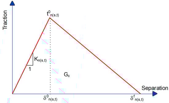 The nominal traction stress vector, represented by t, includes tn for the normal traction and ts and tt for the two shear tractions. δn, δs, and δt denote corresponding separations. The uncoupled traction-separation behavior is normally utilized to model the interface’s working behavior. This uncoupled behavior is applied when the pure normal separation and the pure shear separation do not affect each other [].