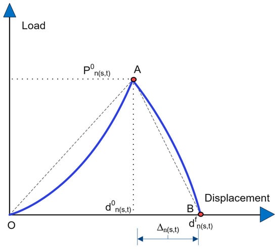 The value of the scalar damage variable, D, is zero when there is no damage and one when the bonding has completely failed. Since the maximum stress criterion was utilized, a linear damage evolution model was adopted in this study. When the bonding experiences complete failure, D reaches a value of one, indicating complete plastic displacement. This displacement is determined by the difference between δfn(s,t) and δ0n(s,t).