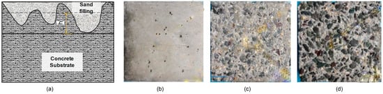 Surface roughness of the concrete substrate: (a) sand-filling method; (b) smooth surface (no sand filling, h = 0 mm); (c) mid-rough surface (sand filling depth of 0.64 mm); and (d) rough surface (sand filling depth of 1.29 mm).