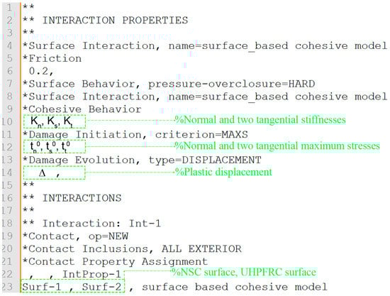 The bonded interface between the NSC and UHPFRC in in situ casting can be accurately modeled using cohesive elements and surface-based cohesive behavior in ABAQUS software []. This modeling approach effectively represents the interface, which is usually composed of a thin layer of UHPFRC material, except in cases of abnormal surface roughness. Therefore, neglecting the surface thickness and using the surface-based cohesive behavior to model the interfacial behavior between NSC and UHPFRC is appropriate.