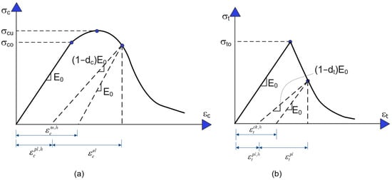 Concrete damaged plasticity (CDP) is widely recognized as the most popular model to simulate the nonlinear response of concrete [,]. The CDP model can simulate cracking patterns and crack widths using dt and dc parameters for tension and compression (Figure 6). Therefore, in this study, the CDP model was chosen to model NSC and UHPFRC. The CDP model requires five additional parameters, including the dilation angle (ψ), the eccentricity of the plastic flow (ε), the ratio of the initial biaxial to initial uniaxial compressive strength (σb0/σc0), and the shape of the failure surface (Kc). Stress-inelastic strain relationships for compression and tension are based on models by Kent and Park [] and Massicotte et al. [] or experimental data. Table 3 presents the parameters of the CDP model for simulations of both NSC and UHPFRC materials.