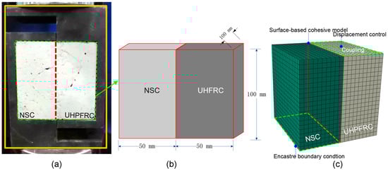In the previous study, Feng et al. [] investigated the effect of various factors on the shear performance at the NC-UHPFRC smooth, mid-rough, and rough interfaces. The concrete substrate and the UHPFRC have compressive strengths of 42 MPa and 120.61 MPa, respectively. Figure 7a,b show the detailed experimental setup and geometry.