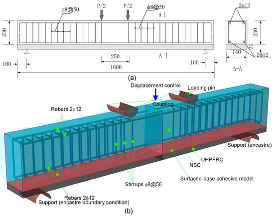 Osta et al. [] studied the flexural behavior of an RC beam strengthened by UHPFRC. The dimensions of the RC beam are 140 × 230 × 1600 mm, made from NSC with a compressive strength of 54 MPa. In order to enhance the structural integrity of the RC beam, a UHPFRC layer of 30 mm with a compressive strength of 121 MPa was applied at the soffit of the RC beam. Figure 9a illustrates the detailed geometry and reinforcements of the NSC-UHPFRC composite beam.