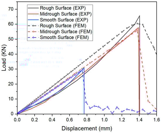 Comparison of the load-displacement characteristics between the EXP [] and FEM for three distinct surface types in the tensile test.