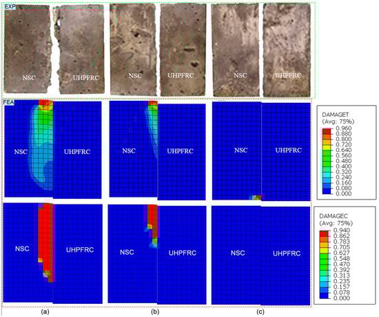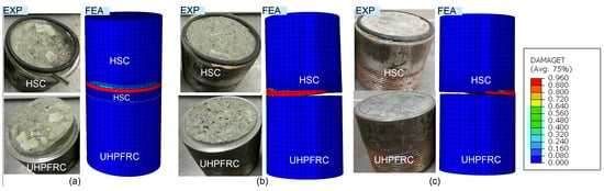 Comparison of the failure of the HSC-UHPFRC specimens between the EXP [] and FEM simulations in three distinct surface types in the tensile test: (a) rough interface; (b) mid-rough interface; and (c) smooth interface.