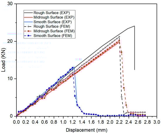 Figure 10 shows a strong agreement between the experimental and simulation results for three surface types in terms of peak loads and displacements. The agreement is demonstrated by small deviations between experimental and simulated ultimate loads, measuring 6.8%, 4.1%, and 5.8% for rough, mid-rough, and smooth surfaces, respectively. Corresponding small errors in displacements at ultimate loads are also observed for the same surfaces, measuring 2%, 0.9%, and 2.4%, as shown in Table 11. The highest deviation of 6.8% is found in the case of the rough surface. It can be explained that in composite members with a rough surface, the strength of the interface between UHPFRC and NSC is stronger than the NSC itself due to the majority of UHPFRC penetrating into the NSC to form the interface. Consequently, the composite member’s shear resistance depends on the NSC’s strength. Therefore, any difference in the strength of the NSC between the EXP and FEM may affect the ultimate load difference between them.