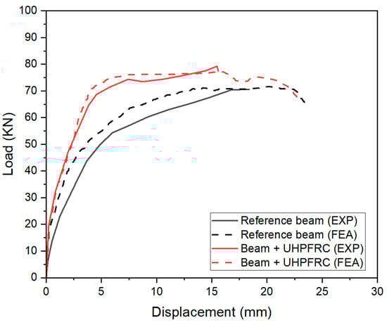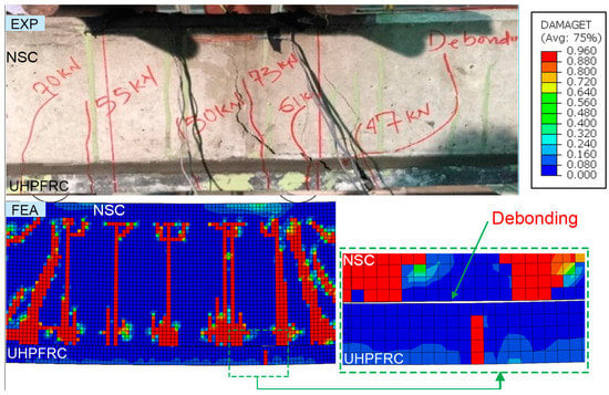 Figure 15 demonstrates a strong correlation in damage patterns between the simulation and experimental results. The results indicate that the debonding between the NSC and UHPFRC primarily occurred at the interface, highlighting the critical role of the bond between the two materials in the overall performance of composite beams. Furthermore, the experimental results revealed the presence of crushing damage at the location of applied loads. This damage may be attributed to the high concentration of stresses in this region, which can exceed the material’s load-bearing capacity. These findings underscore the importance of considering both the bond between the NSC and UHPFRC and the distribution of loads and stresses when designing reinforced and retrofitted concrete structures.