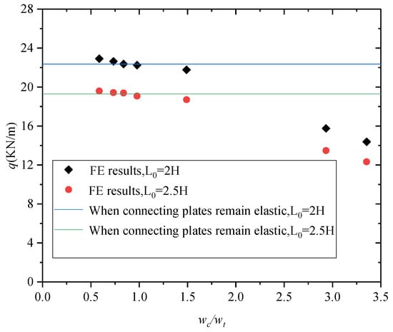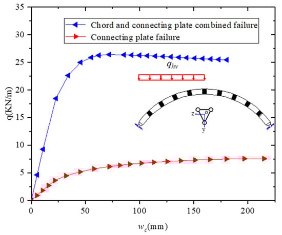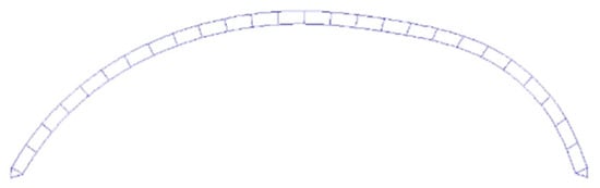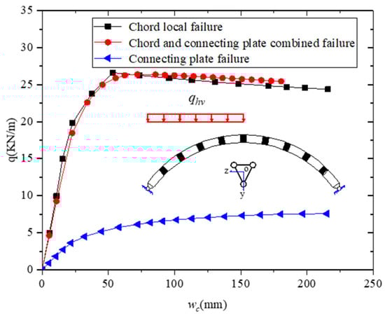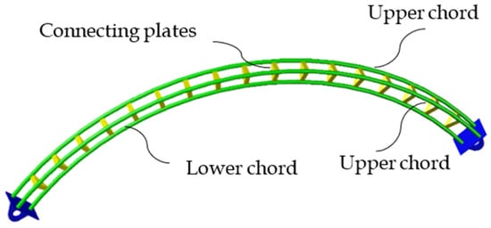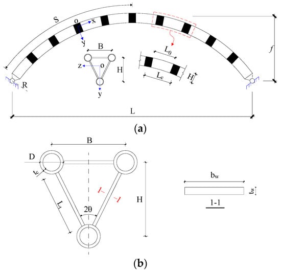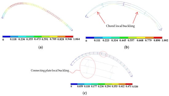 - The limiting conditions to avoid local failure of structural members are discussed. When the slenderness ratio of the chord to the arch under FSURL satisfies < , the chord can be prevented from becoming unstable before the global buckling of the arch occurs. When the slenderness ratio satisfies Equation (18), the connecting plate can be prevented from buckling before the global elastic buckling of the arch occurs. The formula for calculating the shear stiffness of the cross section of the arch is derived theoretically and combined with Equation (6), and the elastic buckling load of the arch when it is subjected to global antisymmetric elastic buckling can be calculated.