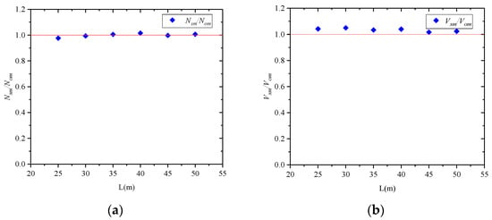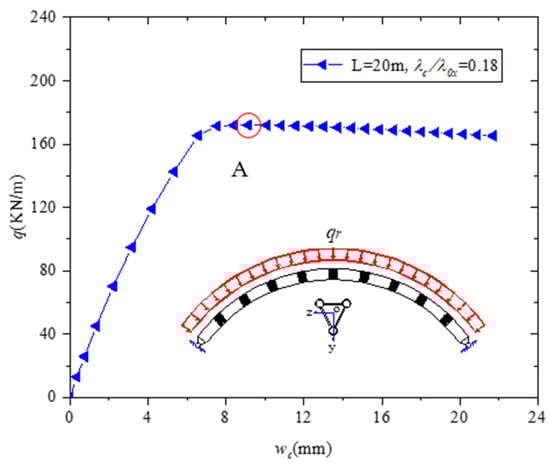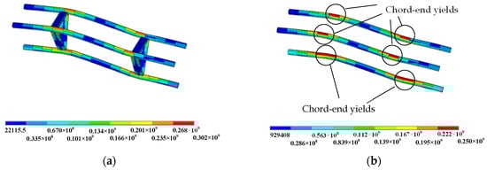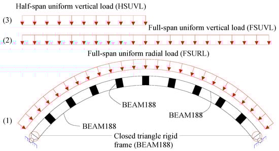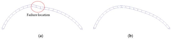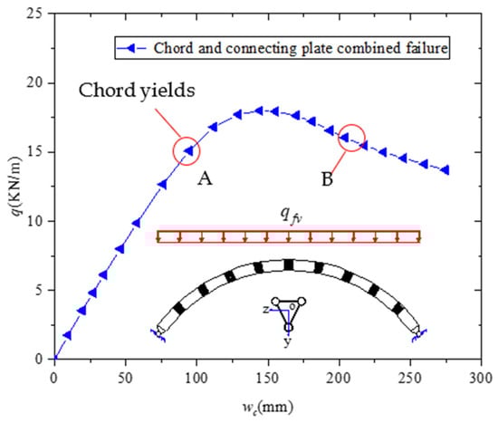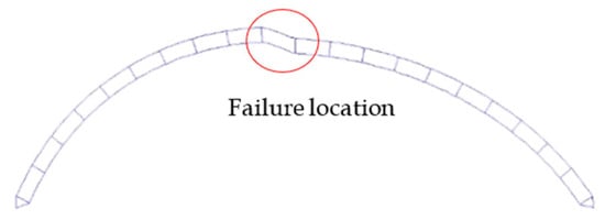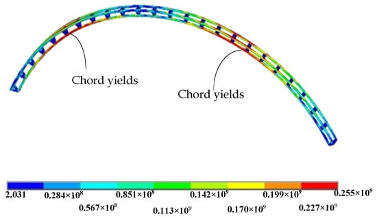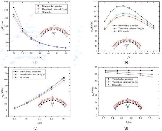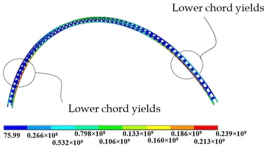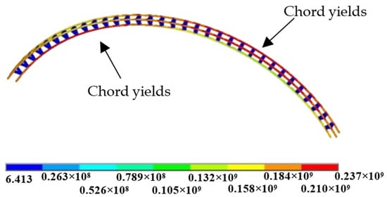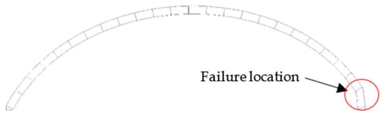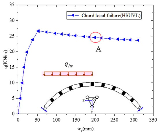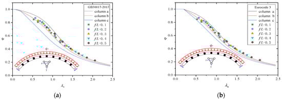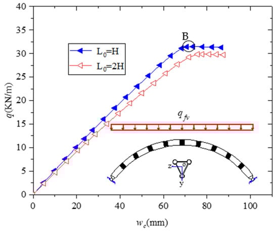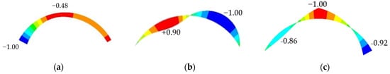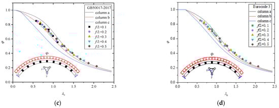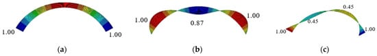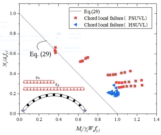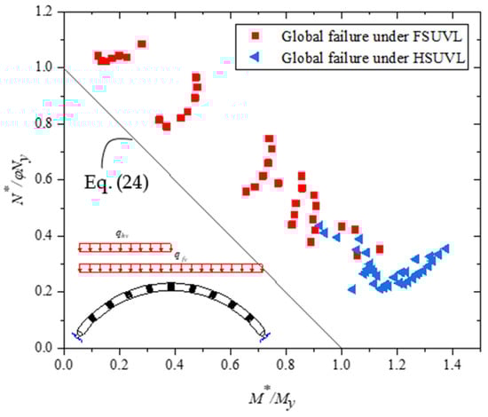 - The global elastic–plastic failure of the arch will occur under FSURL, FSUVL, and HSUVL. Under FSURL, the arch is subjected to uniform compression and will yield at 1/4 of the span and the upper chord at 3/4. The ultimate bearing capacity under pure compression can be verified by Equation (23). The reduction factor is calculated according to column curve b of GB50017-2017 or Eurocode 3. When the arch undergoes global elastoplastic failure under FSUVL, it will yield at the lower chord of both arch feet. Meanwhile, the lower chord yields near 1/4 L and 3/4 L under HSUVL. The proposed Equation (24) can be performed to check the global stability of the arch under the action of FSUVL or HSUVL.