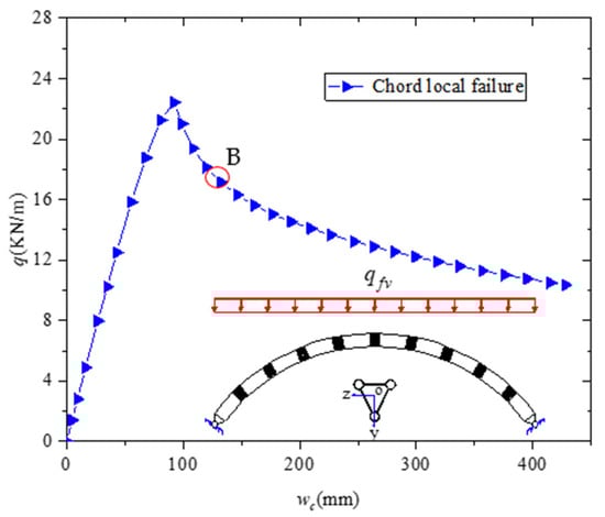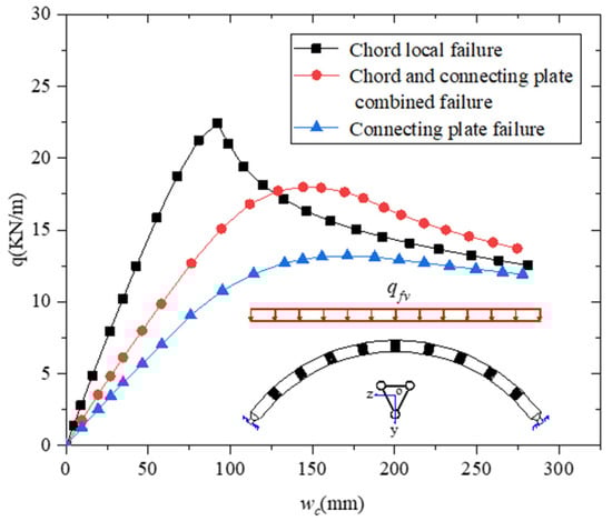 - Under FSUVL and HSUVL, three types of local failure modes of the plate-tube-connected steel circular arch with an inverted triangular cross section are observed. The main influencing factor in the local failure mode of the arch is the change in the stiffness of the connecting plate. A comparison of the three failure modes shows that the chord failure mode is better than the two other types. Therefore, the design of the arch can be controlled by the local failure of the chord. The proposed Equation (29) is used to check the strength of the chord local failure, and the ratio of should be less than 0.7 to ensure that the connecting plate remains in an elastic state.