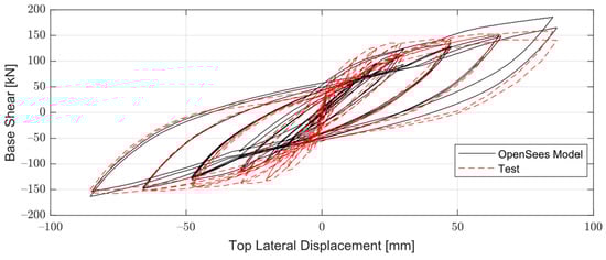 The specimen was modeled with a fiber model, using a force-based formulation in a nonlinear beam–column frame element. The model considered a corotational geometric transformation to include second-order effects and three Gauss Lobatto integration points per element. The wall was discretized in three elements over the height.