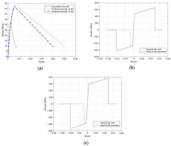 Figure 4b,c shows the stress–strain relationships of Grade 60 and 80 steel for bars at the web and boundary of M1 walls.