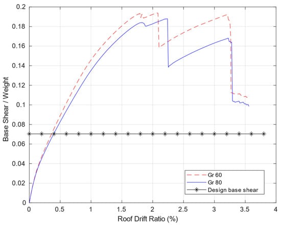 Grade 60 and Grade 80 buildings were subjected to nonlinear static (pushover) analysis under an inverted triangle lateral force pattern in the transverse direction. First, the models were pushed until they reached a target roof drift ratio (RDR) of 5%. Then the structure’s collapse was defined when the pushover curve showed a strength loss of 40% or more.