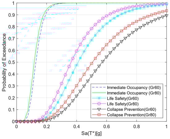 Figure 7 shows the estimated fragility curves for the two buildings. Regarding the seismic fragilities, the performance of the two buildings was quite similar, with a slightly better performance shown by the Grade 60 building for all limit states.