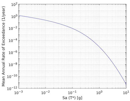 The hazard curve, which represents an estimate of the mean annual frequency of exceedance for each value of Sa(T*), was determined by a probabilistic seismic hazard analysis carried out for the central zone of Chile using the software R-CRISIS v20.0 [