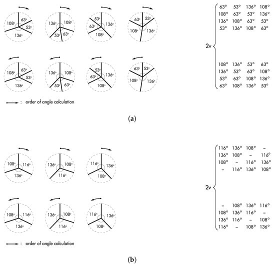 For joints with a smaller valence than v, some cells of their matrix row remain empty, as shown in the first row of the matrix in Figure 1b. The empty cells must be placed at the end of the row, after the angles calculated, and not in-between them, such that the relative order between the existing angle values remains intact. Once the row has been filled with the joint’s angles and any empty cells, their relative is assigned to the specific joint. All possible configurations of this set are then calculated and stored, in the same way they were calculated for the joints with the maximum valence v (Figure 1a). The generated configurations are shown in Figure 1b, demonstrating how the position of the angles and empty cells changes within the matrix, while maintaining their relative order in every row.