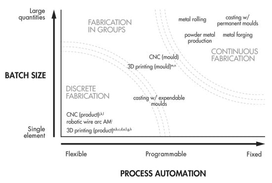 Classification of joint fabrication processes depending on batch size and process automation, and literature examples for each (adapted form []). The boundaries between different fabrication types remain fluid and cannot be strictly defined. (a) Hubs [], (b) Chun et al. 2018 [], (c) Dritsas et al. 2017 [], (d) Souza et al., 2018 [], (e) Tanadini et al., 2022 [], (f) Kladeftira et al. 2021 [], (g) Kladeftira et al., 2022 [], (h) Bach et al., 2023 [], (i) Ariza et al. 2018 [], (j) LANIK Engineers [], (k) MERO [], (l) Octatube [], (m) Niehe 2017 [], (n) Aghaei Meibodi et al., 2019 [].