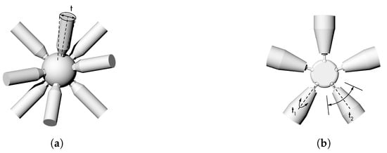 The tolerance embedded in different joint designs. (a) Joint design with minimal tolerance [,]. The tolerance is measured rotationally around the members’ axis. (b) Joint design with a high level of tolerance []. The level of tolerance differs, depending on the plane the members move in. Reprinted with permission from [].