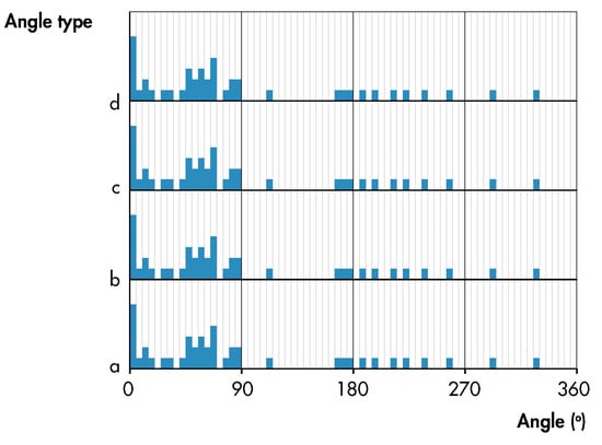 An analysis of the density distribution is carried out and a frequency histogram is plotted for each of the four angles of the case study joints (a, b, c, d), as demonstrated in Figure 5. Every row of the graph describes the frequency histogram of a different angle. The horizontal axis represents the angle values, which lie within the range of (0, 360), while the height of each frequency window is determined by the number of joints that have an angle within this range of values. The width of the frequency windows can vary, depending on the degree of detail required by the designers in each project. In the authors’ experience, the width of 5, used in this paper, provides a compact yet detailed visualisation of the dataset.
