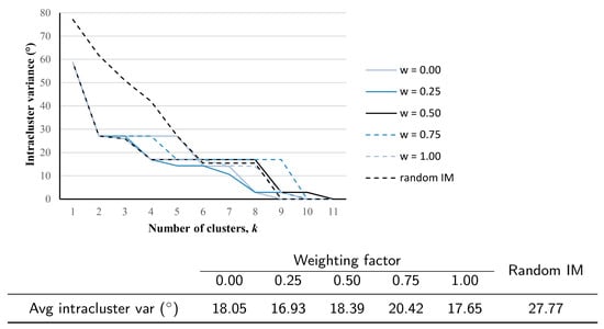 where w ∈ [0, 1] is the weighting factor used. Due to the high computational efficiency of the k-means clustering algorithm, designers can run an initial analysis for various values of w in the early stages of their design development and identify the value that yields the minimum intracluster variance for their designs.