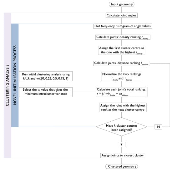 The high diversity in the resulting intracluster variance of the generated clusters, when different weighting factors are used, demonstrates the algorithm’s sensitivity to the initialisation method. The relative effectiveness of the different weighting factors changes, as joints are grouped into different numbers of clusters. This highlights that both the weighting factor and the number of clusters play an important role in achieving efficient clustering results. The overall performance of the factors studied was evaluated by calculating the average intracluster variance of the generated clusters, as shown in Figure 6. As the results show, the performance of different weighting factors is comparable and substantially better than the random initialisation. The factor w = 0.25 had the overall highest performance and was therefore used for this case study. The fact that it is closer to the value of 0 than 1 implies that, for this specific case study, selecting the initial cluster centres in dense areas of the dataset, rather than distributing them, yields improved results. Figure 7 describes the steps of the novel initialisation method developed and its integration with the other steps of the k-means clustering analysis.