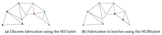 Two options to fabricate the case study joints with a (a) discrete fabrication or (b) fabrication in batches. The different colours represent joints that belong to different fabrication batches.