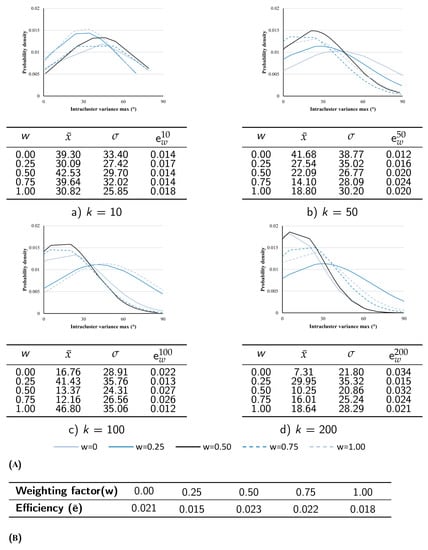 Due to the large-scale structure, the characteristics between different clusters are highly diverse. As a result, a simple extraction of the maximum intracluster variance for a given set of k and w values would not capture the variance distribution and the properties of different clusters, as in the previous example (Figure 6). The standard normal distribution of the maximum intracluster variance is therefore plotted for all cluster values, when different weighting factors are applied, as shown in Figure 10A. The horizontal axis describes the intracluster variance and the vertical axis the probability density of this variance for the respective k and w values. An efficient clustering analysis would exhibit a high probability density for low values of intracluster variance, and would therefore have a low mean and a low standard deviation. The efficiency of a weighting factor e, when joints are grouped into k clusters, is evaluated as the inverse of the sum of the mean and standard deviation for a given value of k, as described below: