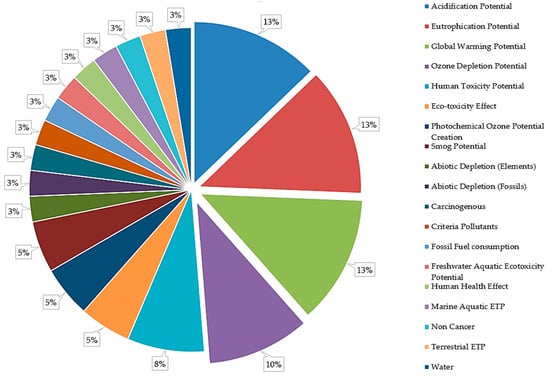 Based on the reviewed literature, the impact indicators are recorded [25,26,27,28,29] and are mentioned in Figure 1. The most assessed indicators are found out to be acidification potential (AP), eutrophication potential (EP), global warming potential (GWP), and ozone depletion potential (ODP). The reference substances to be measured against these indicators are SO2, phosphate, CO2, and R11 (tri chlorofluoro methane) for AP, EP, GWP, and ODP, respectively.