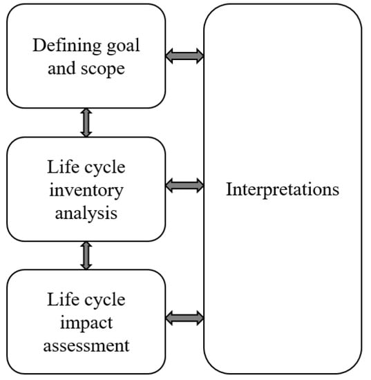 The LCA of a residential building considers the activities starting from raw material supply, manufacturing of products, and application phase to demolition and disposal stage. This assessment provides an overview of the major environmental impacts at different phases of construction. LCA was implemented based on the ISO 14040 standard [39]. The framework includes 4 stages viz. defining goal and scope, life cycle inventory analysis, impact assessment, and interpretation of results (Figure 5). The first stage defines the goal, background, and need of the study. Inventory analysis lists the raw materials and products that are inputs at various phases of the system. Impact assessment identifies the major indicators that are responsible for environmental effects and the last stage interprets the results obtained and evaluated [40,41,42].