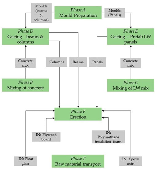 The environmental implication of the proposed prefabricated system is to be evaluated. The application of various sustainable alternates into the proposed mix designs have proved the system to be lightweight, energy efficient, and thermally insulated [34]. Hence, this study investigates the environmental effects during their production phase to on-site erection phase. The effect of the energy involved and transport during all the phases were also taken into consideration.