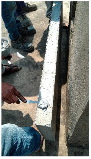 This phase includes the process of erection of the prefabricated elements into a model house. The cured prefabricated elements were transported from the manufacturing plant to the site. They were placed in their respective slots as per the design (Figure 13). The elements were joined with the help of epoxy grout (Figure 14). Minor gaps after the complete erection of elements were filled with grouting material. The completed small-scale model house is as shown in Figure 15. A solar photovoltaic (PV) panel was embedded into the roof of the model with an approach of generating on-site energy to meet the in-house demands.