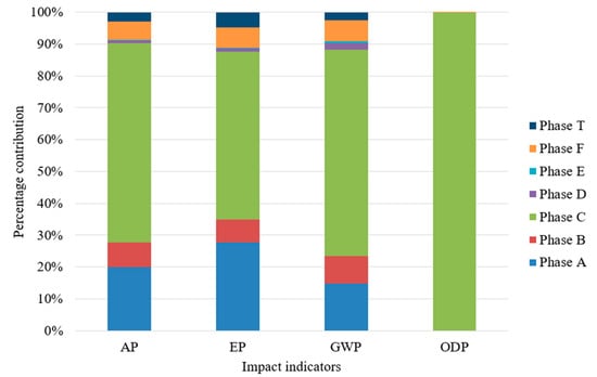 The percentage contribution of each impact indicator on different phases is presented in Figure 16. Phase C viz. mixing of CFA-based LW mix was observed as the major contributor towards impact indicators. This phase was observed to be a major activity in terms of raw material involved and the quantity of output. On comparison among other phases, this phase solely contributes over 62%, 52%, 64%, and 99% to AP, EP, GWP, and ODP, respectively. Following this, the next major contributor was observed to be phase A, then phases B, F, T, D, and E consecutively.