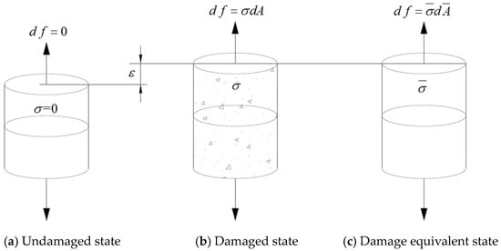The damage variable () is used to define the degree of damage to materials in continuum damage mechanics, and it is shown in Equation (1) [25]. The constitutive relationship of materials under coupled damage can be achieved through effective stress theory and equivalent strain theory.