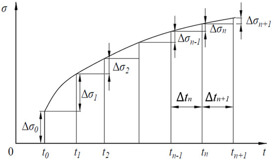 The concrete creep model describes the strain growth under constant stress. In the numerical simulation, the time (t) is divided into smaller periods, and for each Δt, the corresponding equilibrium equation is established to find the increment of stress in this period. Figure 3 shows this process. Stress history plays a crucial role in creep deformation [29]. Generally, the cumulative creep deformation at a specific time can be realized by calculating and storing the stress values of each element in the finite element model at all times. Zhu [30] proposed an improved explicit algorithm with variable step size and an implicit algorithm.