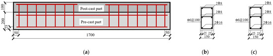 The beam has a rectangular section with a length of 1700 mm and a width of 150 mm; its height depends on the height of the post-cast section, and the concrete cover is 25 mm. The precast section is the existing concrete with dimensions 150 mm × 200 mm. The width of the post-cast part is 150 mm, and its height is set according to the purpose of the study: 0, 50, 100, or 150 mm. The stirrup size of the post-cast part is consistent with that of the precast. Two HRB400 steel bars with a diameter of 8 mm are arranged at the upper part of the section, and two HRB400 steel bars with a diameter of 16 mm are arranged at the lower part of the section under a positive bending moment.