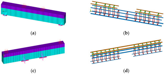 The finite element model of the concrete beam: (a) The component under a positive bending moment; (b) the reinforcement skeleton under a positive bending moment; (c) the component under a negative bending moment; and (d) the reinforcement skeleton under a negative bending moment.