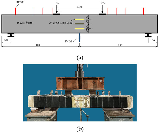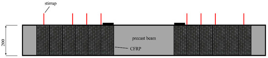 The cross-sectional design is consistent with the numerical model. According to code GB50010-2010 [31], the stirrups of the precast beam should be extended into the lamination layer to guarantee the overall stability of the composite concrete beam. The internal hoops of the cast-in-place concrete are not closed hoops after this setting. On the other hand, cracks generated by fatigue damage are randomly distributed in the concrete [32]. Although the beam undergoes bending failure under static loading, the oblique section shear failure may occur under fatigue loading [33]. Therefore, the shear capacity of the precast beams is guaranteed by adhering carbon fibers to the inclined section to ensure that they do not undergo shear failure during fatigue loading [34,35,36]. The reinforcement schematic is shown in Figure 6.