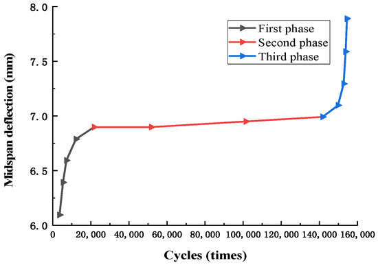 Firstly, the static loading test was conducted to measure the ultimate bearing capacity of the beam so as to determine the fatigue load and the creep load. The static loading test was performed in three phases. In the first phase, each stage was loaded with 3.0 kN before cracking, and in the second phase, each stage was loaded with 5.0 kN from cracking to the theoretical ultimate load-bearing capacity of the component (72.6 kN). In the third phase, 3.0 kN was loaded until the component failed. The maximum value under the stable state during loading, i.e., 106.0 kN, was taken as the actual ultimate load-bearing capacity of the component.