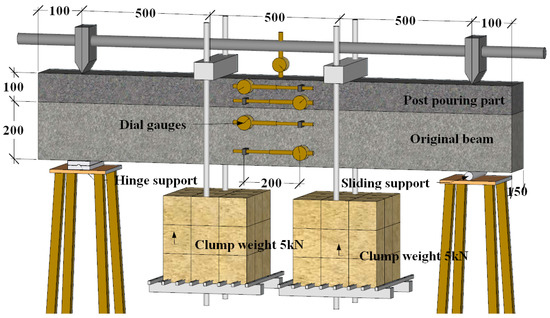 The design of carbon fiber reinforcement is according to code GB50367-2013 [37]. Carbon-fiber-reinforced plastic (CFRP) is pasted on the shear span of the precast beam, so it has a slight influence on the bending bearing capacity of the beam, which can ensure that the damage to concrete primarily concentrates in the pure bending section in the fatigue test [38]. The CFRP is U-shaped, is pasted on the whole side and bottom of the beam, and has a thickness of 0.111 mm [39]. The design value of the tensile strength of the CFRP is also 1120 N/mm2. The CFRP is removed at the end of the fatigue test, and the lamination layer is cast. The purpose of pasting the lamination layer is to improve the load-bearing capacity of the section and prevent the shear failure of the beam. The casting size is shown in Figure 4, and the materials are consistent with the precast part.