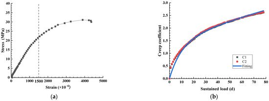 where is in the loading period of τ and the moment of the creep degree of , , , , , , , , and represent the parameters determined by the standard creep test of concrete. Section 5.1 displays the specific values of these tabulated parameters.