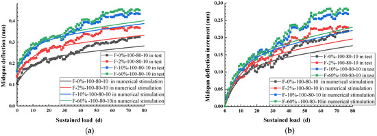 According to Figure 17a, if the additional deflection caused by the difference in the beam shrinkage is not taken into account, the deflection of both damaged and undamaged laminated components under the influence of creep diminishes with age. The deflection of beam A-60%-100-365-10 and beam A-60%-100-3650-10 is 0.252 mm and 0.264 mm at the age of 365 and 3650 days, respectively. It increases by approximately 0.01 mm in 3285 days. For the same material, creep declines with increasing the loading age. This law is also reflected in the creep model used in this paper. A lower creep results in a lower creep strain for the same stress state, leading to a smaller beam deflection. For the same loading age, damage to the beams enlarges their midspan deflection increment, implying that raising stress increases the creep of the beams.