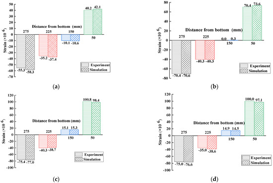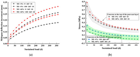 This section investigates the effect of reinforcing damaged beams on their creep development from a stress perspective. Thus, different heights of the post-cast layer are set for comparison, as described in Section 3.1. Figure 18 presents the test results.