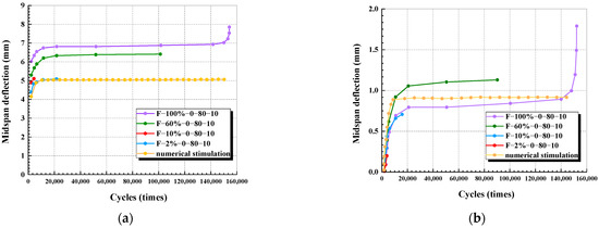 Figure 19a demonstrates that, under a negative bending moment, fatigue damage increases the midspan deflection of the beams compared with the undamaged beam under the effect of creep. After increasing the cross section, the deflection increment of the damaged components declines to some extent, and the creep deflection increment of damaged component MS-60%-100-365-10 and undamaged component MS-0%-365-10-100 decreases by 21.6% and 32.0%, respectively, after 365 days of sustained loading. Therefore, increasing the cross section better controls the deflection of the damaged components under a negative bending moment.