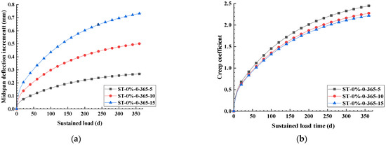 Figure 15a shows that the midspan deflection increment of the concrete beams is significantly higher under larger loads because creep correlates closely with the distribution and magnitude of stress on concrete. The undamaged beams are continuously loaded with 5 and 15 kN for 365 days, with midspan deflections of 0.270 and 0.734 mm, respectively. Although the distribution of stress on the beam is not uniform, the stress on the beams under large loads is generally higher than that on the beams under small loads. This is also why the strain of the beams under large loads is generally higher than that of the beams under small loads.