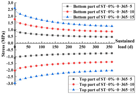 According to a previous study, the creep of concrete components is proportional to the stress when the stress on them is lower than 40% of their strength [45]. The creep coefficient is similar to this case. It can be inferred from Figure 15a that there is a distinct difference in the creep coefficients of the three components: the creep coefficients of the beams under larger loads are relatively smaller. This is because the stresses at various points of the beam constantly change over time and are affected by multiple factors other than the strain effects (see Figure 16). Although the strain is linearly related to the stress under creep, the change in stress does not correlate linearly with the load. As a result, the creep coefficients of the beams under various loads are not identical.