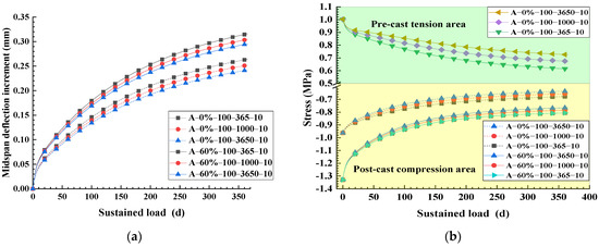 The creep of the concrete with different heights of reinforcement under a negative bending moment: (a) midspan deflection increment and (b) the section stress.