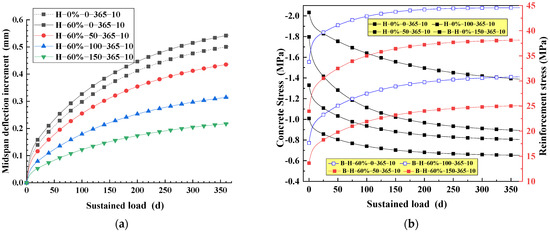 As shown in Figure 18a, the deflection of damaged unstrengthened beam H-60%-0-365-10 increases under the effect of creep compared with undamaged beam H-0%-0-365-10 at a loading period of 365 days. The incremental creep deflection of the beams declines with increasing the height of their reinforcement. The incremental creep deflection of the beams with a strengthened section height of 50, 100, and 150 mm decreases by 0.107, 0.228, and 0.326 mm, respectively, compared with beam H-60%-0-365-10 at a loading period of 365 days. Indeed, increasing the section height makes the damaged components more rigid and weakens the stress state of the section under the same bending moment. Further, the creep strain is slight when the stress is low, reducing the deflection increment of the beams. In addition, the incremental deflection of the strengthened damaged beams is lower than that of the undamaged beams (H-0%-0-365-10). The method of reinforcing damaged beams with laminating post-cast parts offers promising results in terms of controlling their creep deflection; in particular, increasing the section height has a profound effect.