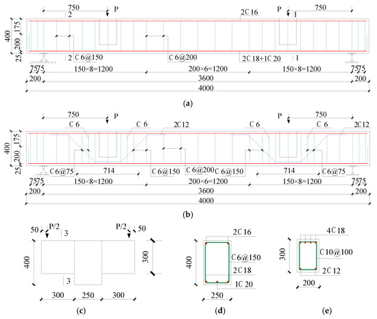 Schematic diagram of beams under indirect loading (dimension in mm). (a) Specimens CWJJL1, JJLH1, and JJLH2. (b) Specimens CWJJL2, JJLH3, and JJLH4. (c) Loading of secondary beams. (d) Primary beam. (e) Secondary beam.