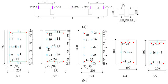 In the fire tests, the furnace temperature, temperature distribution in cross-section, applied load, and deflection for each beam were measured, as shown in Figure 4. The heating system of the furnace chamber adopted the international standard ISO834 fire curve [19] to control the heating, while the furnace temperature was measured using a thermocouple. The LVDTs layout of the beam during thermomechanical coupling is shown in Figure 4a, while the LVDTs layout of the beam without load during the fire test is shown in Figure 3f. The thermocouple arrangements on the cross-section of the beams are shown in Figure 4b.